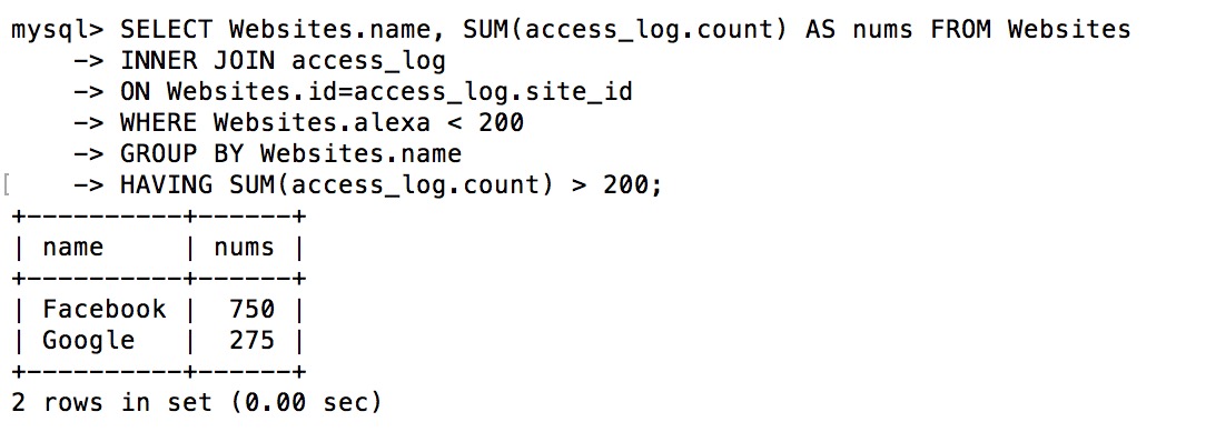 现在我们想要查找总访问量大于 200 的网站,并且 alexa 排名小于 200。