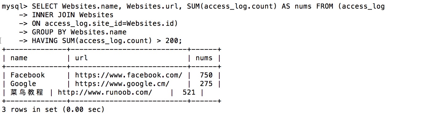 执行以上 SQL 输出结果如下: