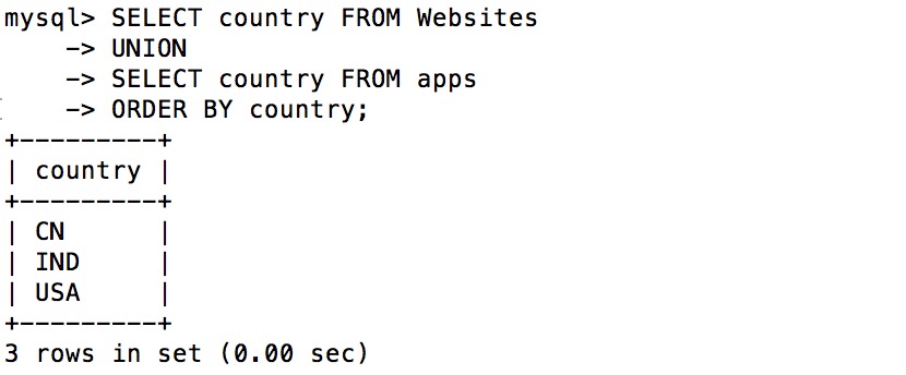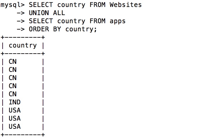 注释:UNION 不能用于列出两个表中所有的country。如果一些网站和APP来自同一个国家,每个国家只会列出一次。UNION 只会选取不同的值。请使用 UNION ALL 来选取重复的值!