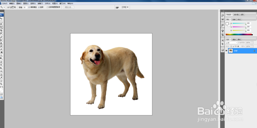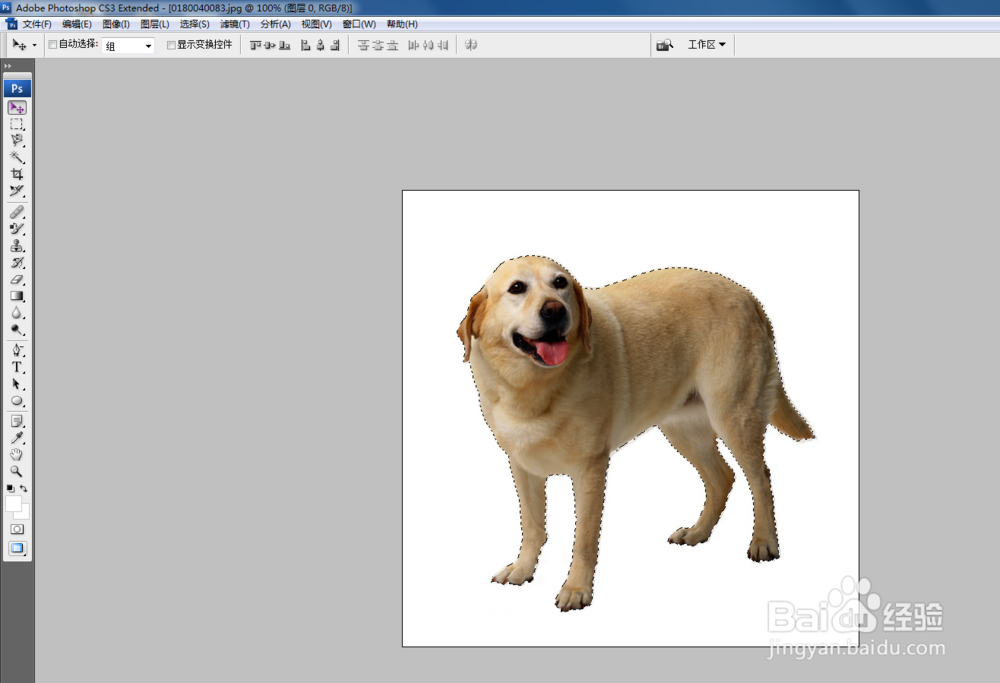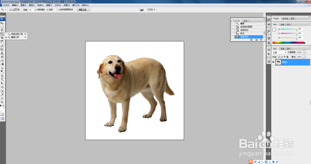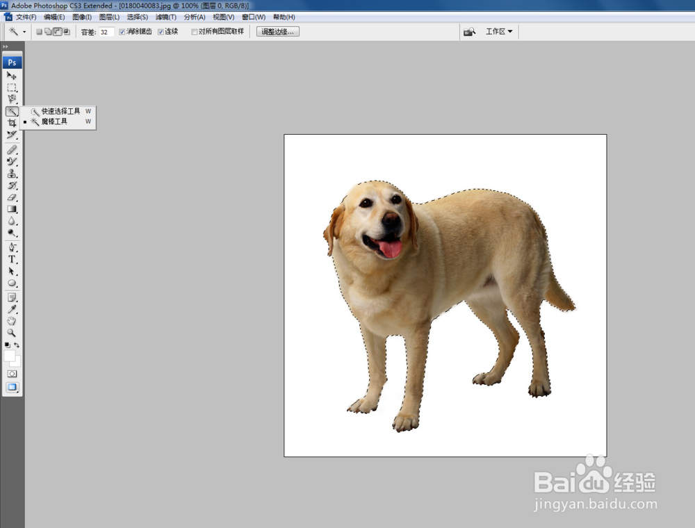 然后选择左侧的魔棒工具按钮,点击图片的空白处,现在选择的是空白区域,然后点击鼠标右键选择反向,就可以选择到需要的物体。