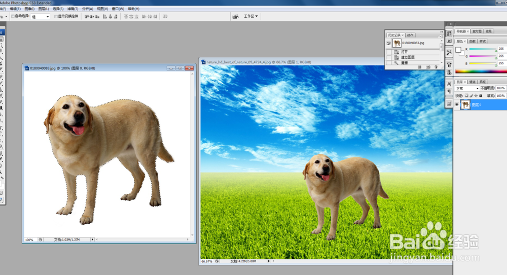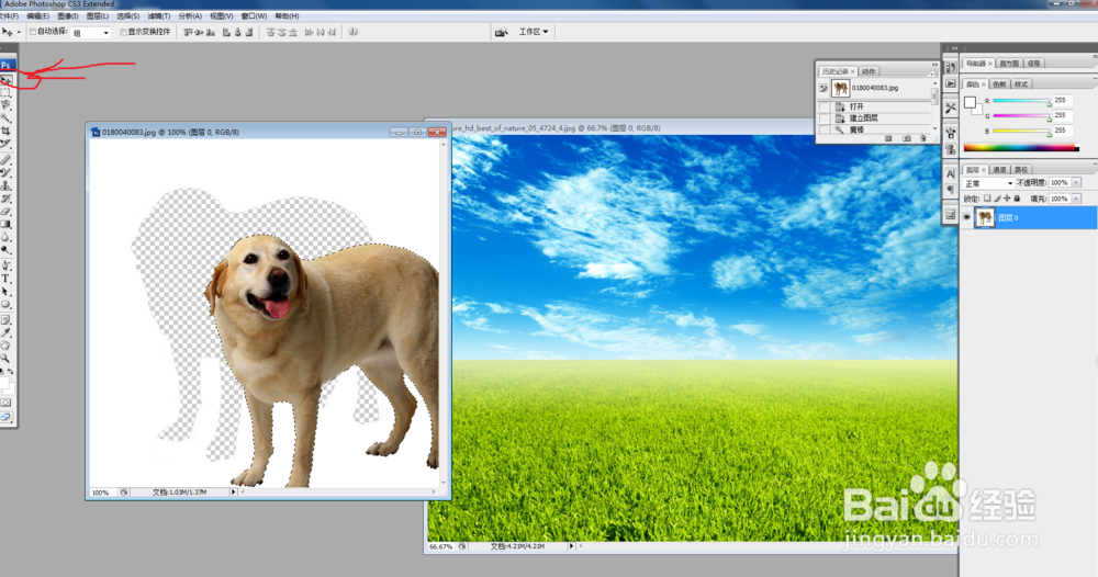 下一步就要把图片组合了,把两张图片缩小,选择移动按钮,把选择的物体移动到需要的背景图片中。