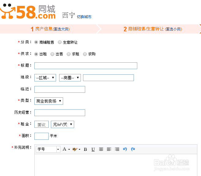 这个根据自己的情况填写,补充说明这一块就多写一点地段、装修、合适做饭馆还火锅什么的,也可以上传一些照片。(这地方要遇到注册的账号登陆)